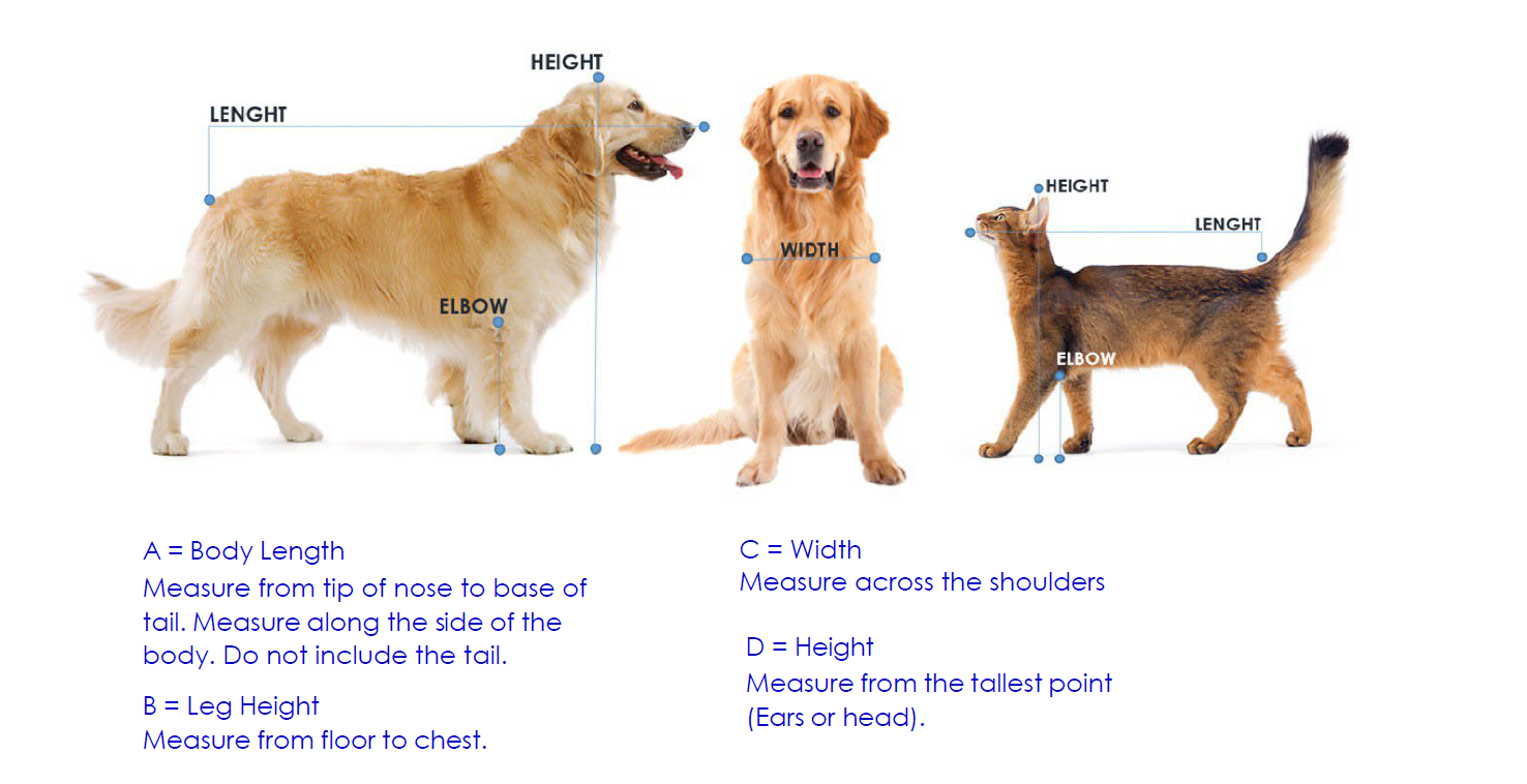 Please refer to the above image on how to accurately measure your pet/s length (A),height (B), width(C) and elbow(D)